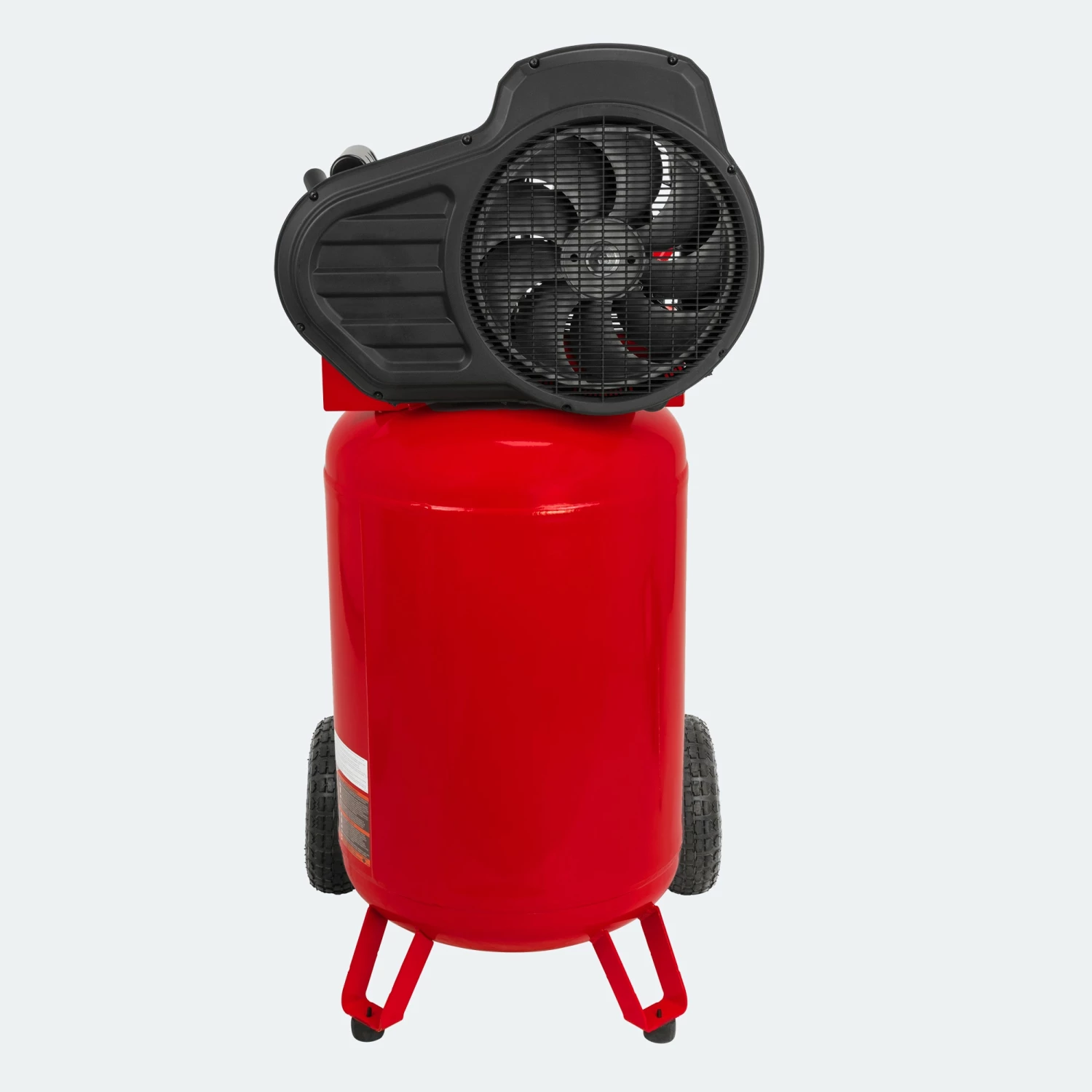 One of the more powerful air compressors currently available for consumers, the Craftsman 30 gallon air compressor features an innovative twin cylinder online oil lube pump that delivers 175 max PSI along with 6.2 SCFM at 90 PSI. At 76 dBA, the oil lubricated twin cylinder pump with cast iron construction is 23% quieter versus Porter Cable 30 gallon 135 PSI compressors. The Craftsman 30 gallon air compressor is equipped with a high flow regulator that provides 65% more usable air pressure delivered to the air tool. The vertical portable space saving tank design and pneumatic 10 in. wheels make it easy to move around the shop, garage, or on a work site. Whether you want to inflate your tires, work under the hood or do some medium duty metal working, the Craftsman 30 Gallon oil lube vertical air compressor is perfect for the job.