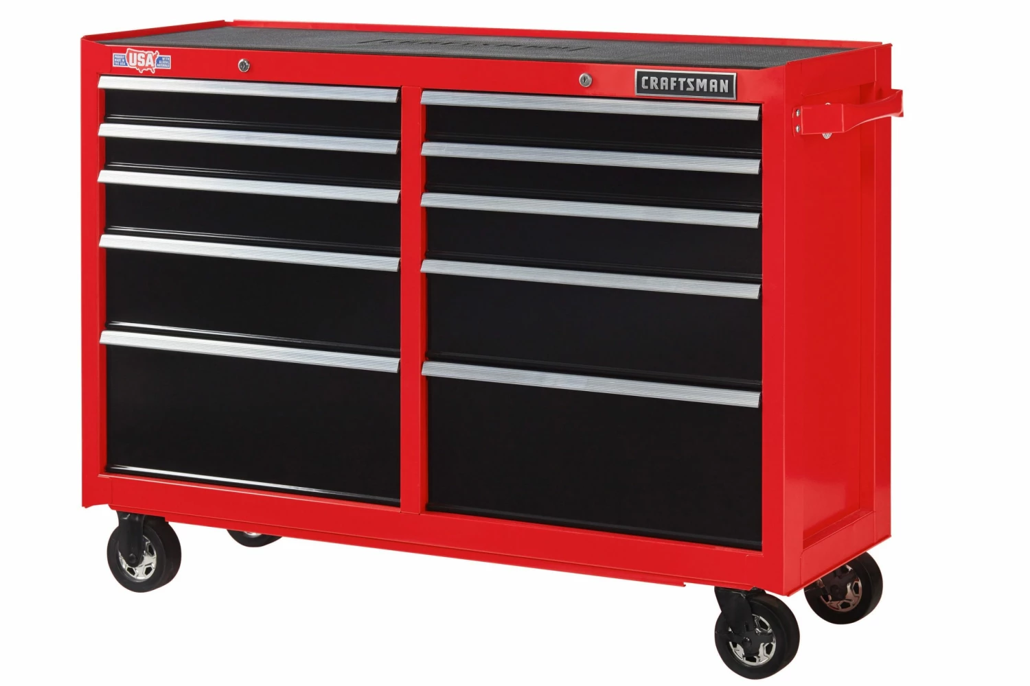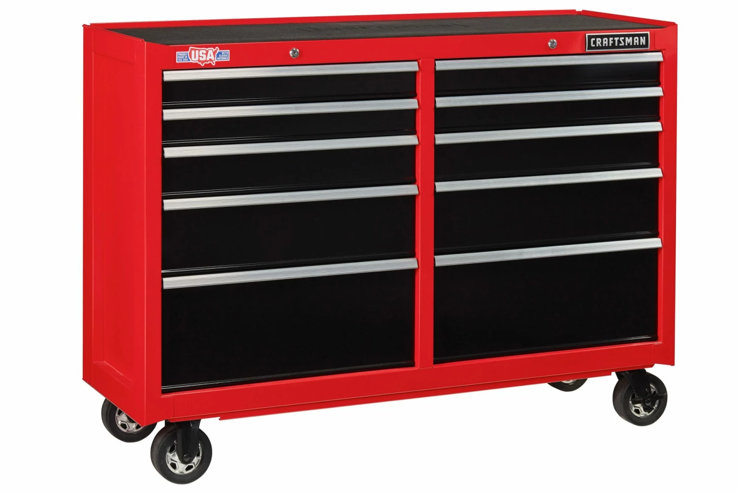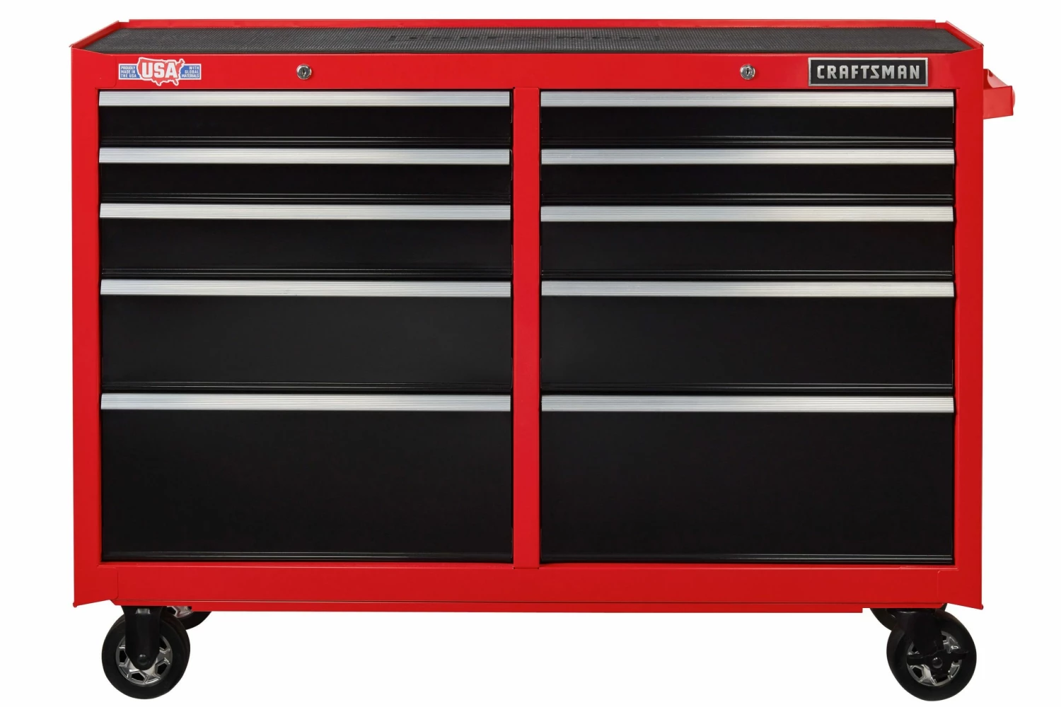 Proudly Made in the USA with Global Materials this 2000 Series 52-in Wide 10 Drawer Rolling Tool Cabinet can support 100-lbs and features heavy-duty soft close drawer slides that gently pull themselves shut without slamming. Combine this metal tool cabinet with the matching tool chest, and you’ll have the ultimate tool organizer.
