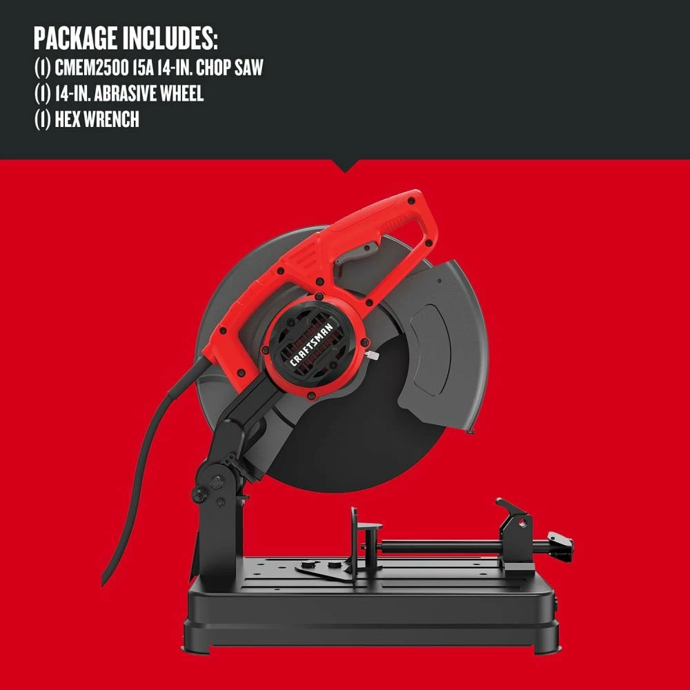 - Includes (1) CMEM2500 15A 14-in Chop Saw; (1) 14-in Abrasive Wheel; (1) Hex Wrench