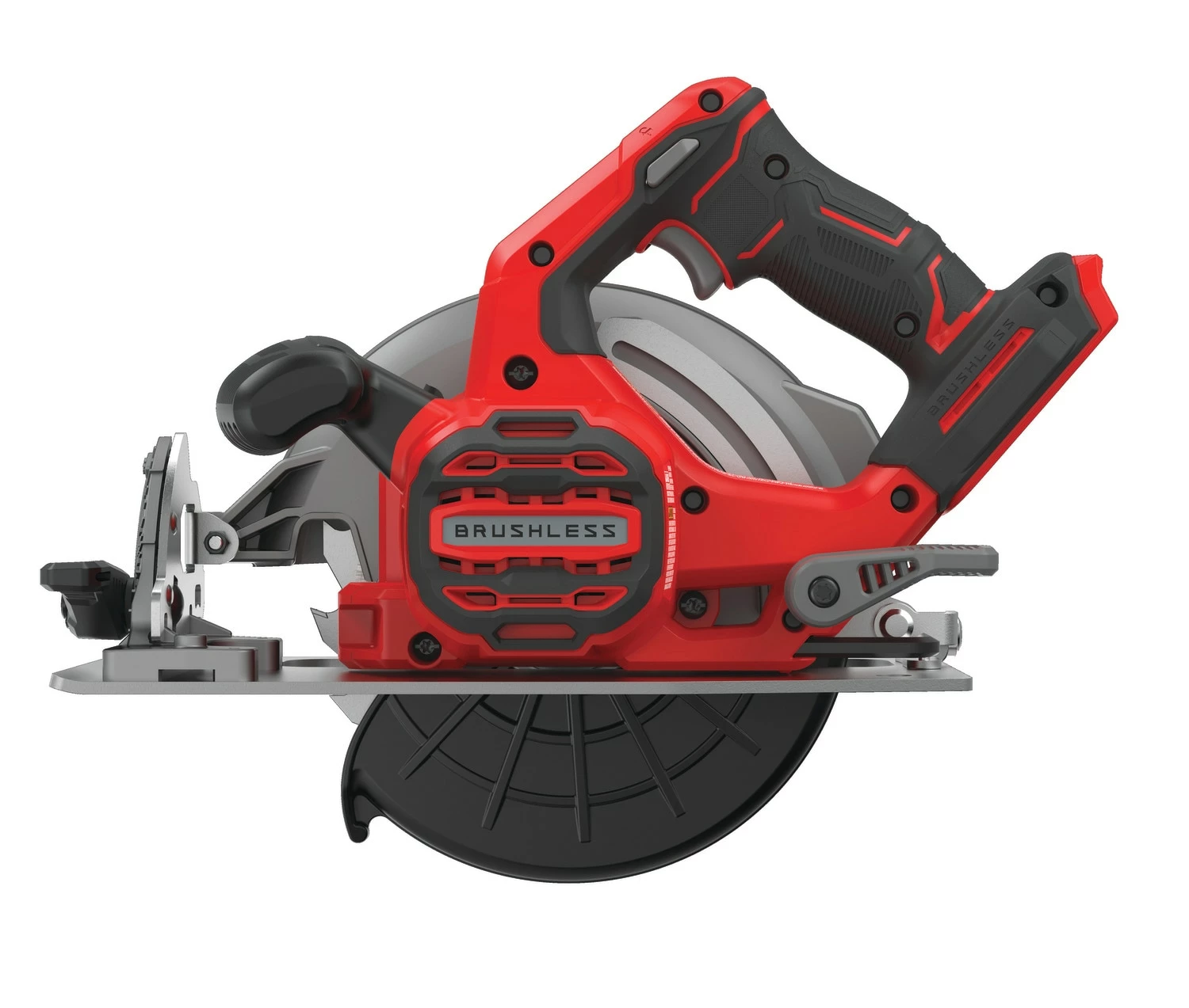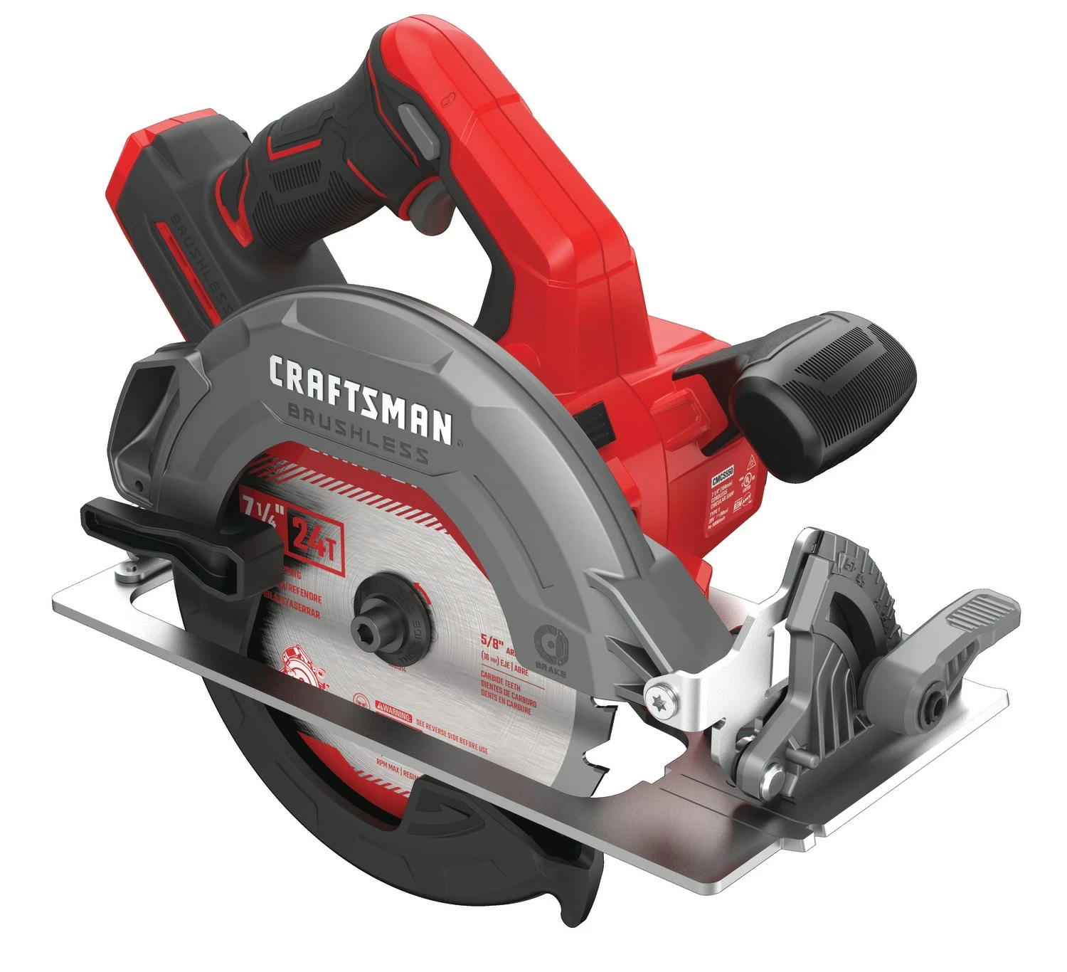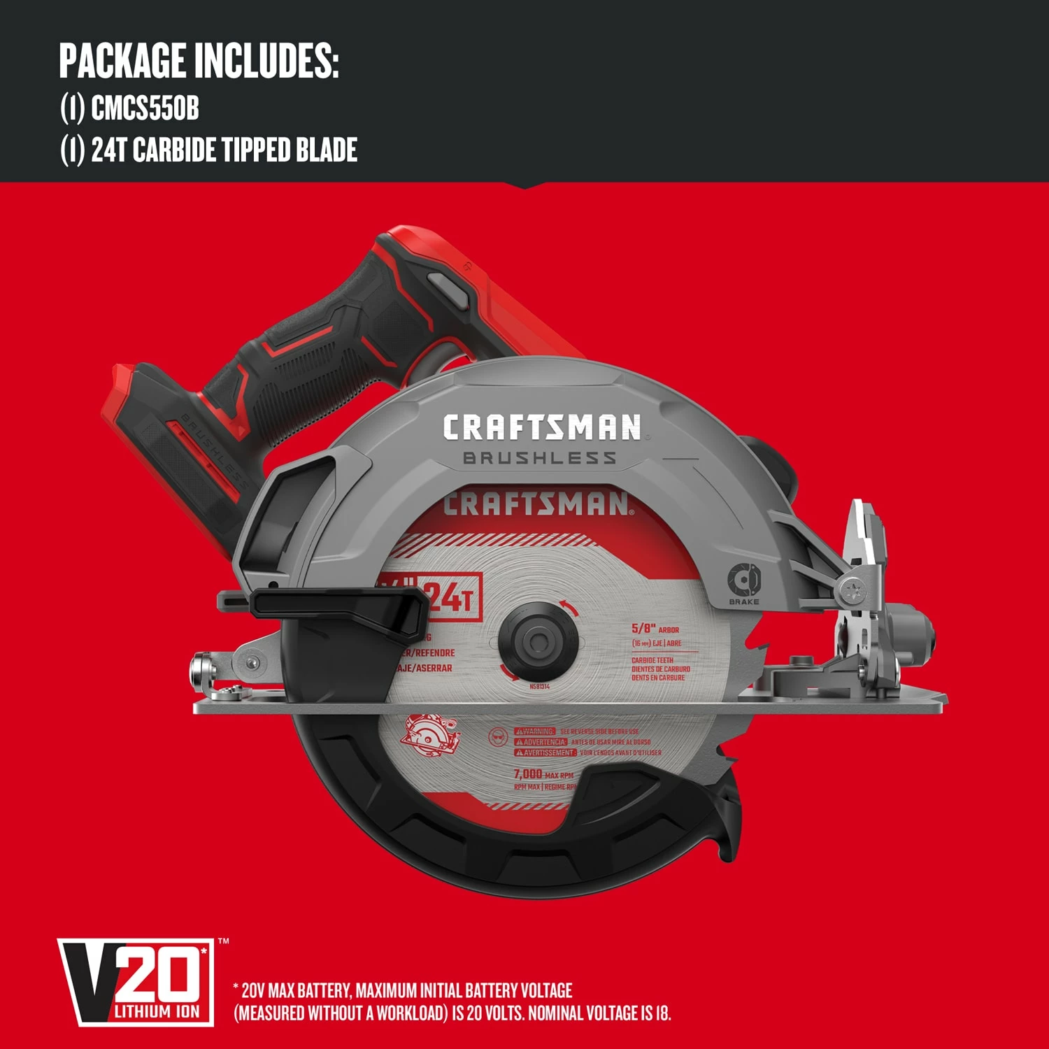V20 7-1/4-in Cordless Circular Saw (Tool Only) has a high performance brushless motor allowing the user to complete everyday cross and rip cuts with a large depth of cut; 2-9/16-in. The improved durability of the upper metal guard and stamped aluminum shoe will protect this unit on all of your projects. The user brake allows for user convenience and safety. The compact and lightweight design helps reduce user fatigue and the contoured over-molded handle is optimized for comfort.