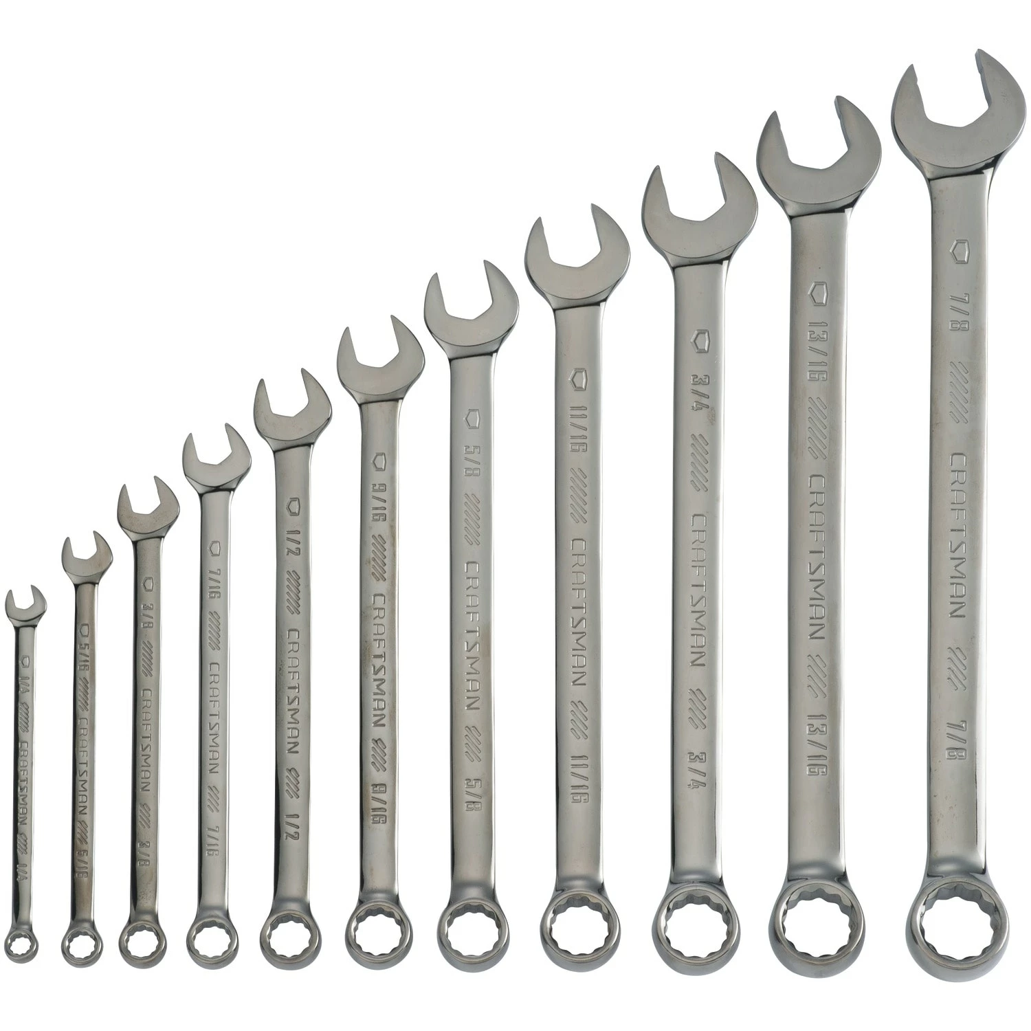 - Includes (11) Long Panel Gunmetal Chrome Combination Wrenches SAE (1/4-in, 5/16-in, 3/8-in, 7/16-in, 1/2-in, 9/16-in, 5/8-in, 11/16-in, 3/4, 13/16-in, 7/8-in)