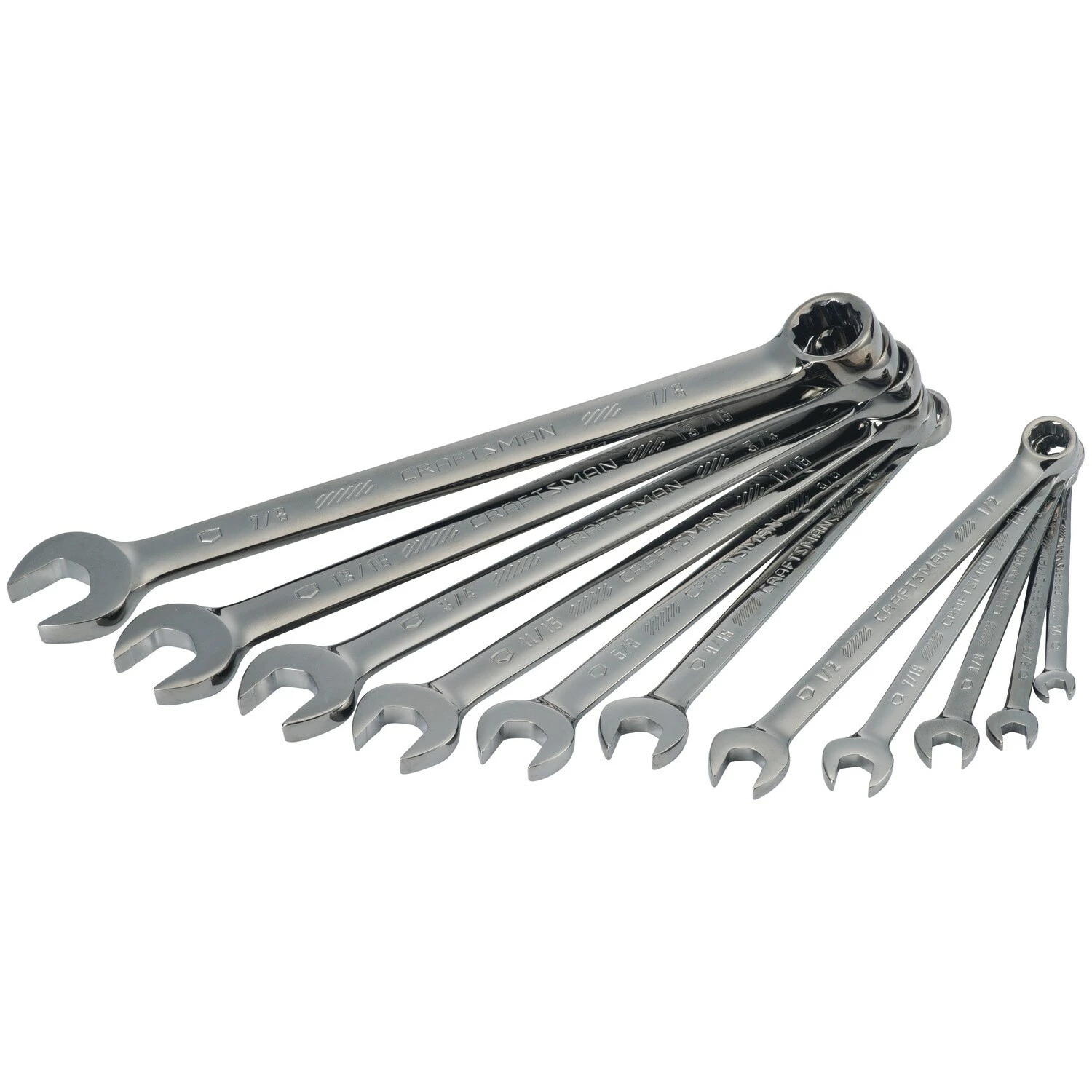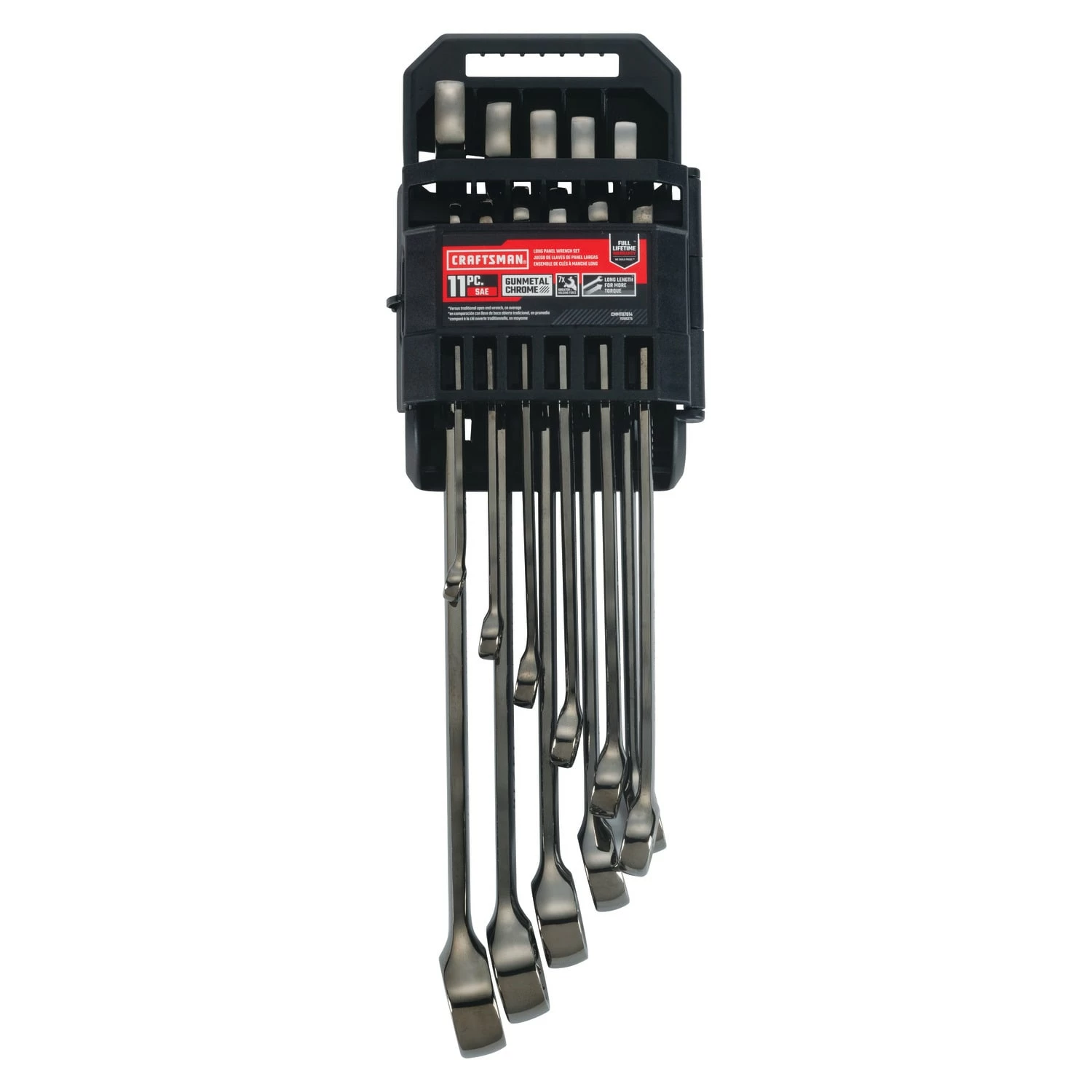 The CRAFTSMAN® 11-piece SAE Long Panel Gunmetal Chrome Combination Wrench Set offers a number of applications from the standard bolt turning to working on specific automotive repairs.