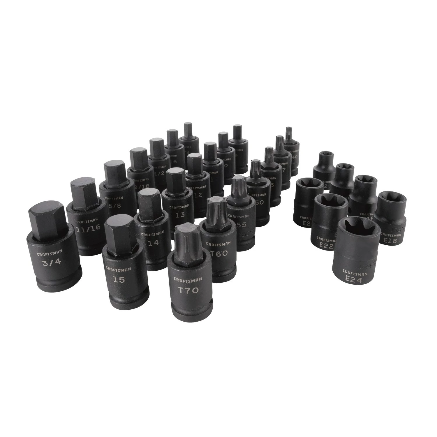 - Also includes (7) 1/2-in Drive Torx Impact Bit Sockets (T40, T45, T47, T50, T55, T60, T70) and (7) 1/2-in Drive External Torx Impact Bit Sockets (E12, E14, E16, E18, E20, E22, E24)