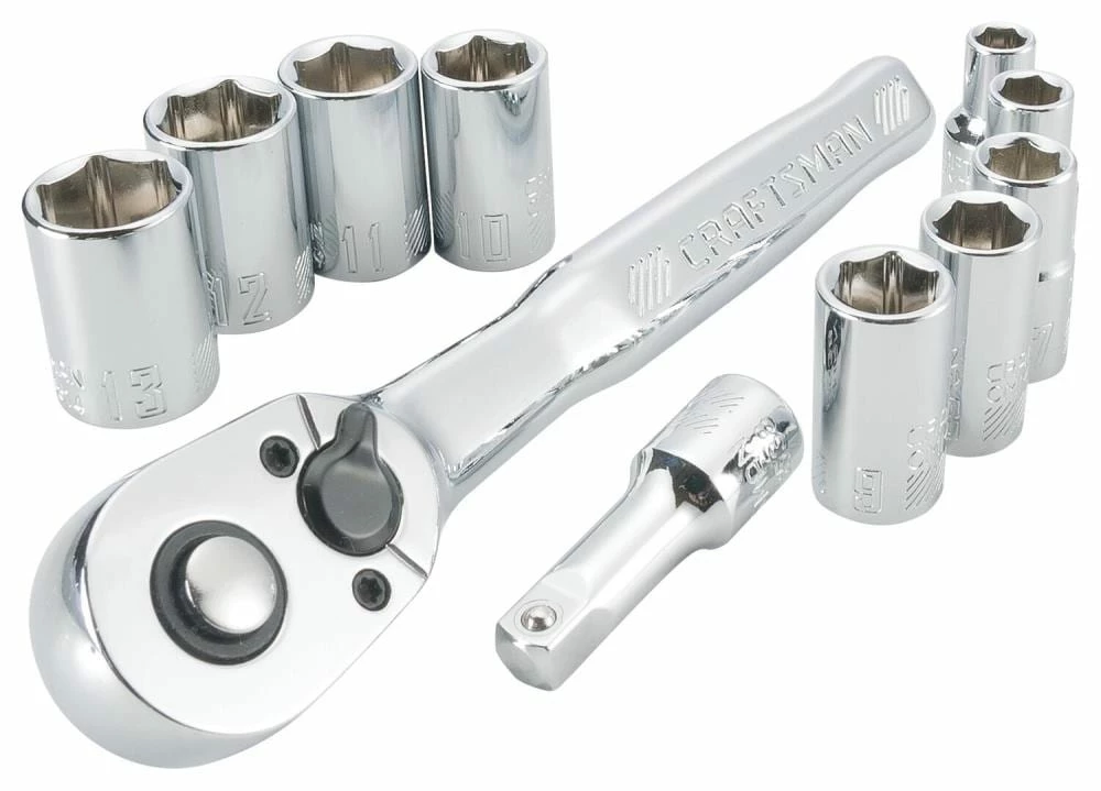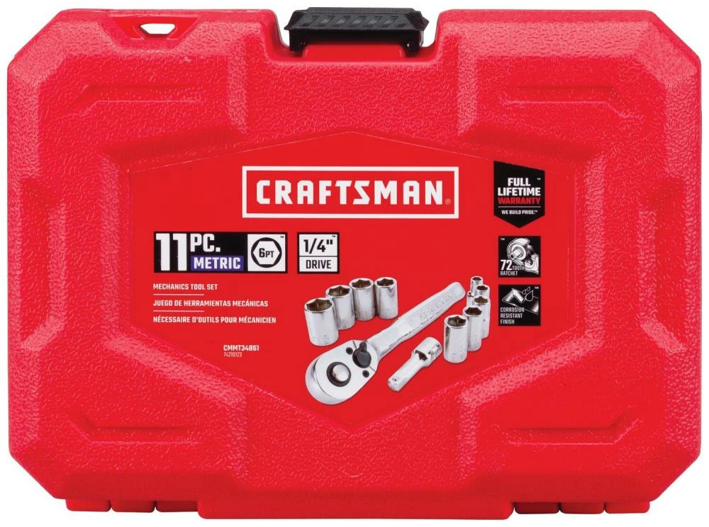 Craftsman 11 piece Metric Socket Wrench Set comes with nine sockets of varying sizes (5, 6, 7, 8, 9, 10, 11, 12 and 13 mm), a 1/4 inch drive ratchet and a 1-1/2 inch extension bar all neatly organized in a durable black plastic case, which clearly marks the socket sizes in easy to read raised numerals.