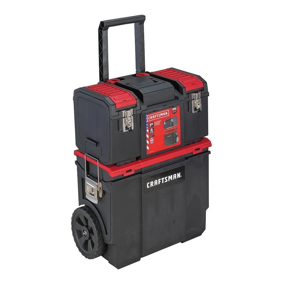 Proudly Made in the USA with Global Materials in Cheraw, South Carolina. 3-1 Rolling Mobile Workshop includes a large storage bin, middle organizer and top tool box. This tool box was constructed with a robust structure and large volume. The pull handle provides convenient maneuverability and folds down for storage.