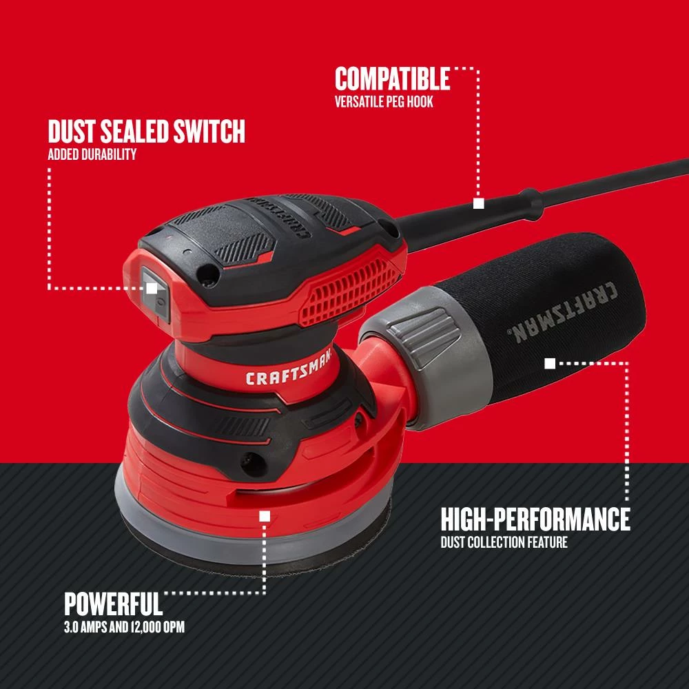 3.0 Amp 5-in Random Orbit Sander with 12,000 OPMs is ideal for surface preparation, smoothing seams, and removing paint or varnish. The low profile design for added control and reduced vibration.