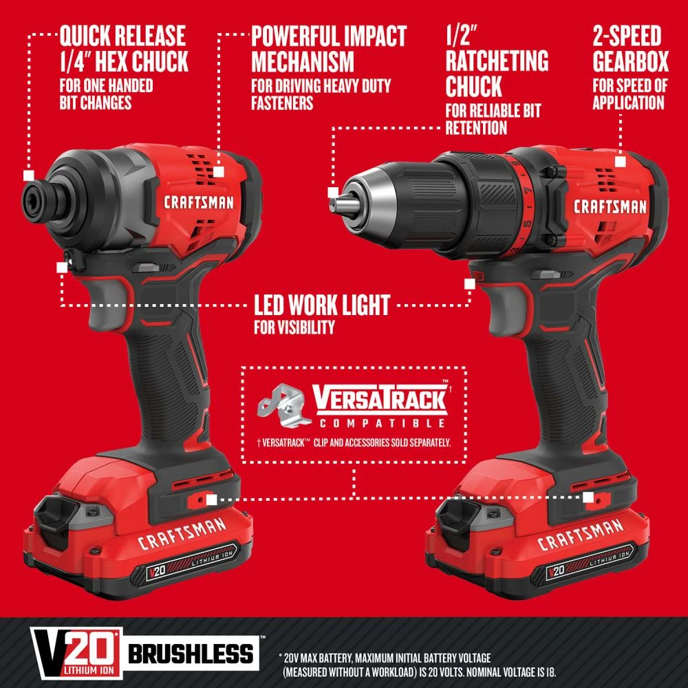 The CRAFTSMAN V20 Cordless Brushless 4 tool combo kit (2 batteries) provides the ability to complete a variety of construction applications. Brushless tools deliver a performance solution for your drilling, fastening and cutting needs.