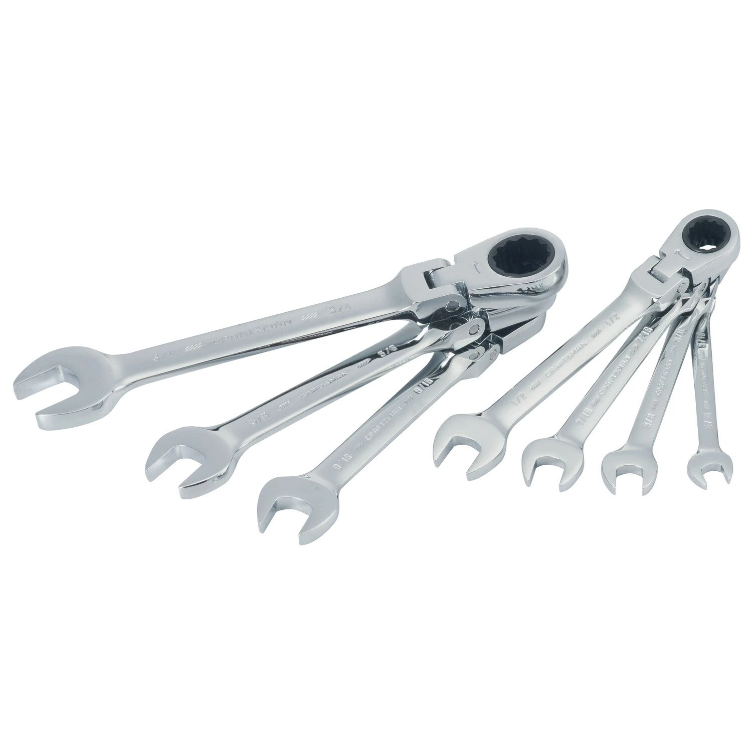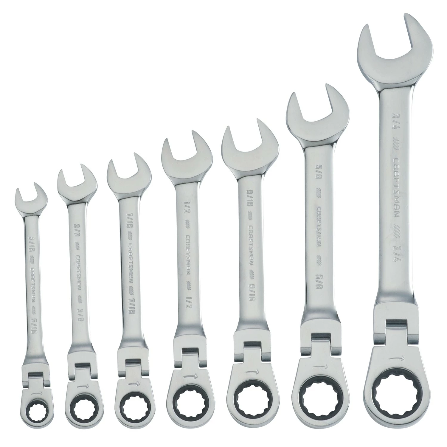 The CRAFTSMAN® 7-piece Standard (SAE) Flex head Ratcheting Wrench Set provides a versatile box end design. The Ratcheting head can flex 180 degree, which provides greater accessibility.