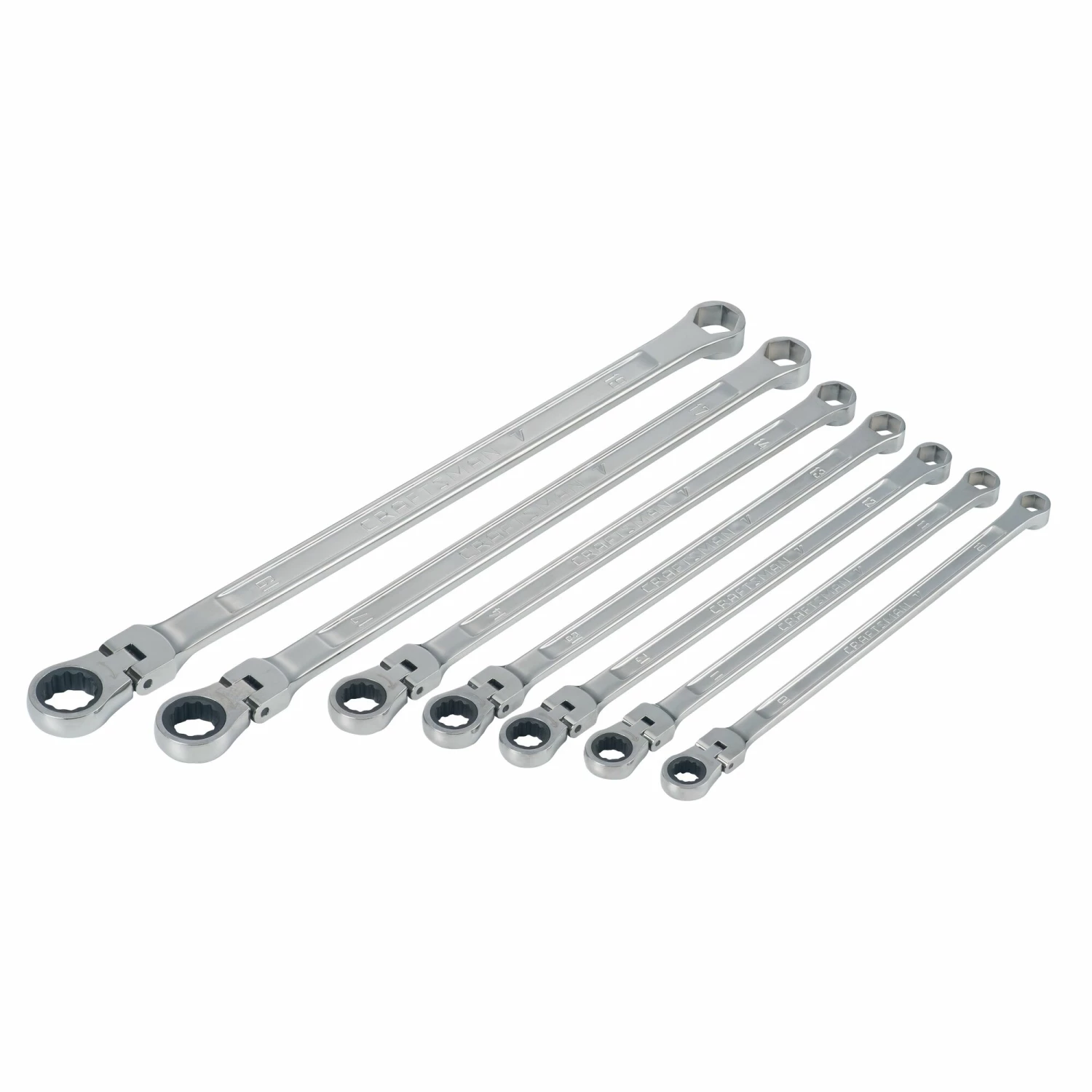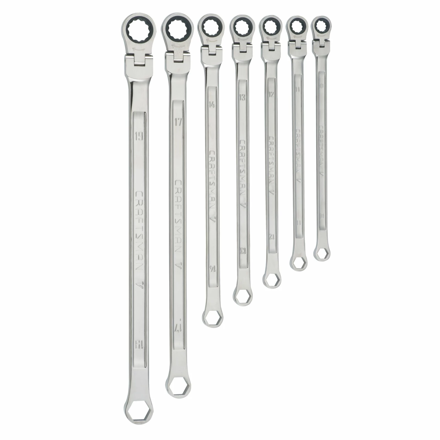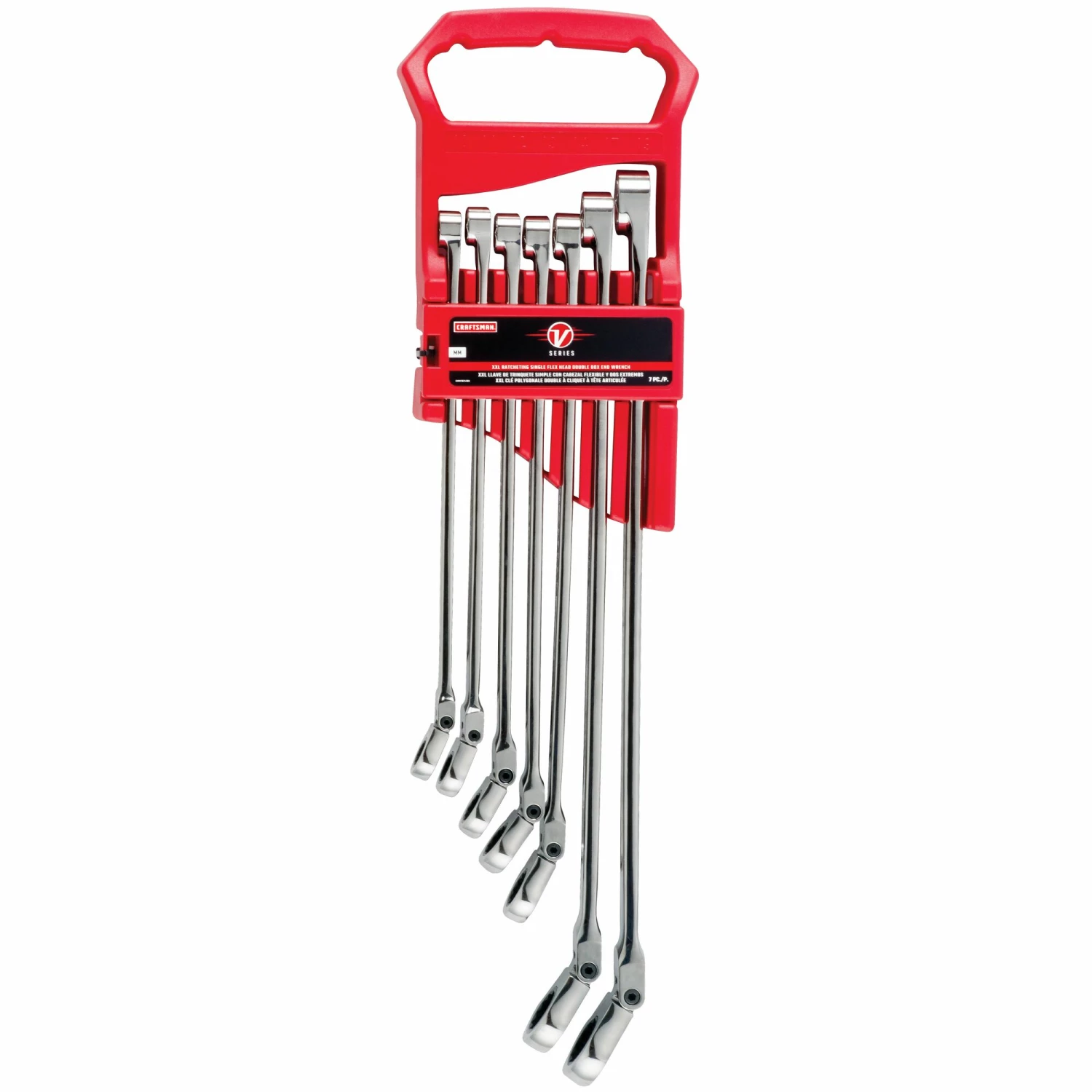 The V-Series 7PC. XXL Metric Ratcheting Single Flex Head Double Box End Wrench delivers unprecedented performance to the Craftsman brand. Engineered for professionals, this ratcheting wrench set features a 72 tooth design on one box end, which provides users with a quick and durable ratcheting solution. The extra long handle features a light weight I-beam design that allows for greater control while maintaining optimal strength. Finally, the other end features a 6-point extended box end design, which provides greater access and engagement of fasteners in recessed positions. The vertical wrench rack is design to fit into most metal storage drawers to provide users with an organized method of storing their wrenches. Backed by Craftsman’s Lifetime Warranty, this product is designed to deliver the quality and durability expected from the Craftsman brand. If the product fails to perform for any reason, we will replace it. Return damaged product to a stocking Retail Partner or call 1-888-331-4569 for details. No proof of purchase required.