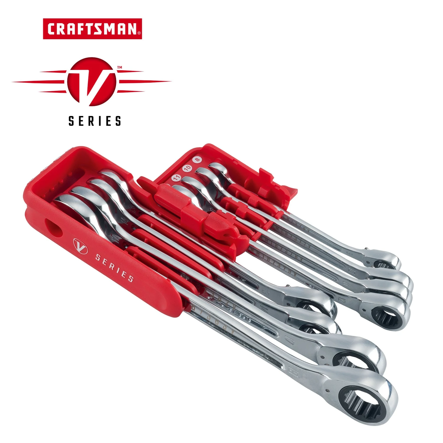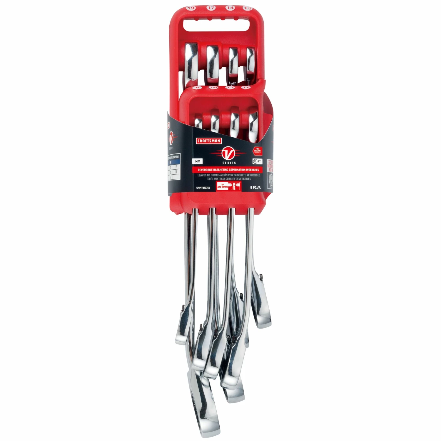 The V-Series 8PC. Metric Reversible Ratcheting Combination Wrenches deliver unprecedented performance to the Craftsman brand. Engineered for professionals, this reversible ratcheting wrench set features a 72 tooth design on the box end, which provides users with a quick and durable ratcheting solution. The handle features a light weight I-beam design that allows for greater control, while maintaining optimal strength. Finally, the open end features a low profile design for greater access in tight spaces and does not damage fasteners in high torque applications. The vertical wrench rack is design to fit into most metal storage drawers to provide users with an organized method of storing their wrenches. Backed by Craftsman’s Lifetime Warranty, this product is designed to deliver the quality and durability expected from the Craftsman brand. If the product fails to perform for any reason, we will replace it. Return damaged product to a stocking Retail Partner or call 1-888-331-4569 for details. No proof of purchase required.