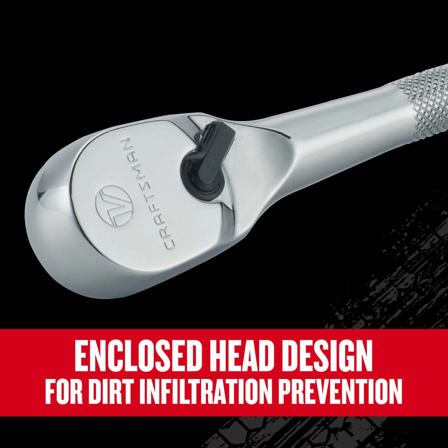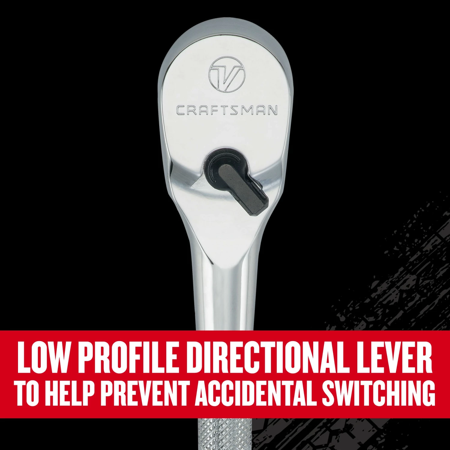The V-Series 1/2-in Drive Ratchet delivers unprecedented performance to the Craftsman brand. Engineered for professionals, this 1/2-in Drive Ratchet is constructed with a Precision Engineered Gear that provides users with improved tool life and durability. Its 96 tooth design produces a short 3.75 degree arc swing that enables users to access the tightest of spaces without sacrificing strength. Backed by Craftsman’s Lifetime Warranty, this product is designed to deliver the quality and durability expected from the Craftsman brand. If the product fails to perform for any reason, we will replace it. Return damaged product to a stocking Retail Partner or call 1-888-331-4569 for details. No proof of purchase required.