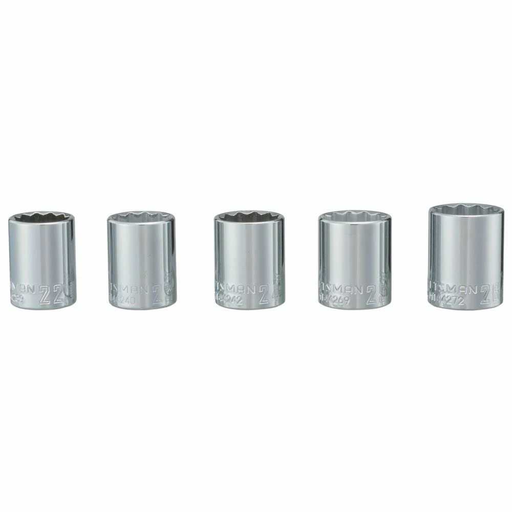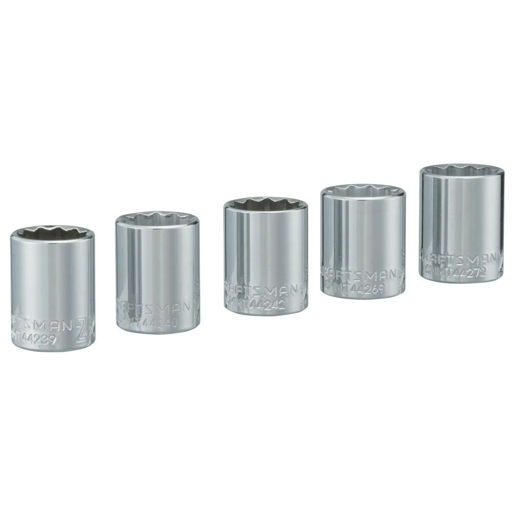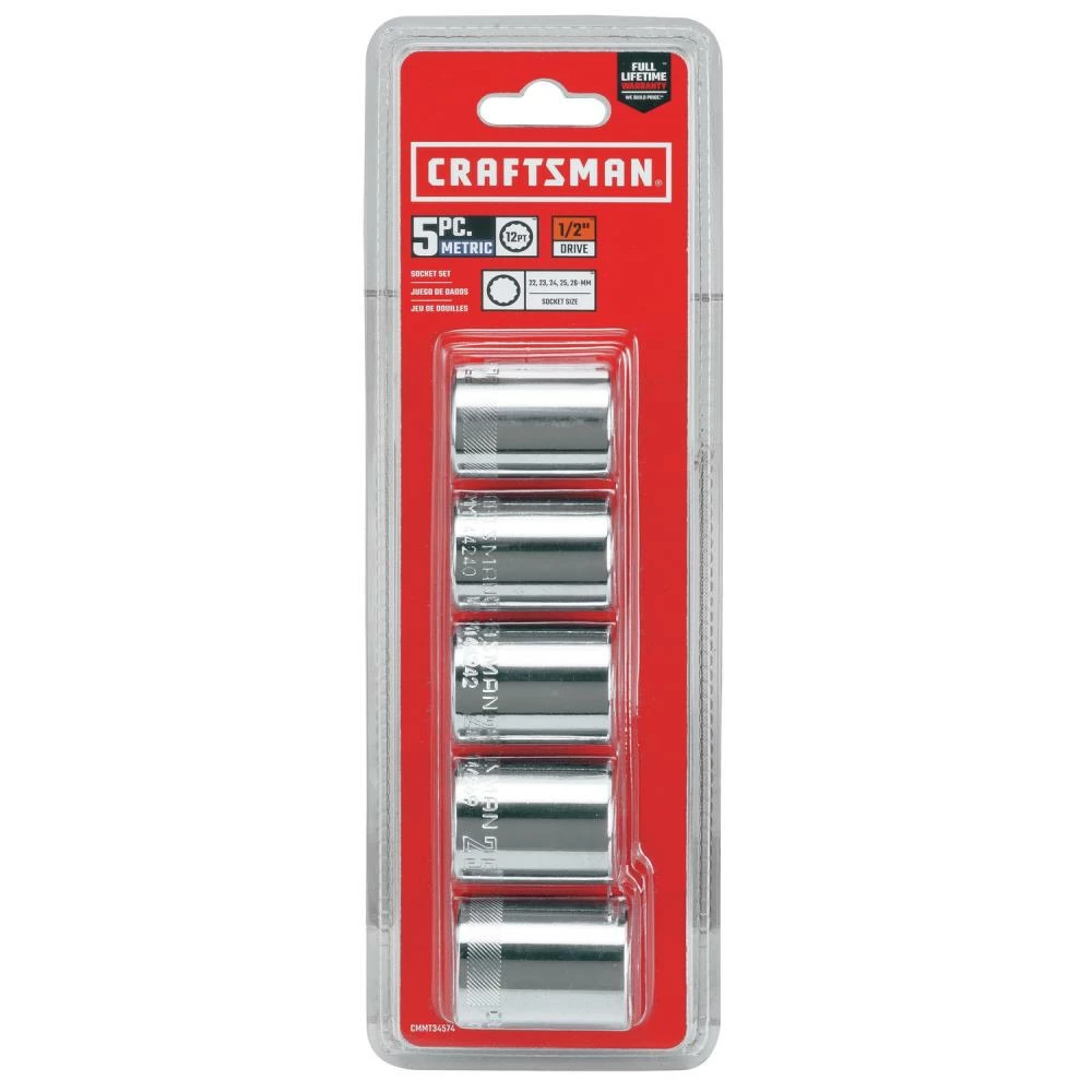 The CRAFTSMAN® 5-piece Large Size Metric Socket Set has high-visibility, high-contrast Easy-To-Read sockets with easy-to-see size markings. This set resists fading, chipping and corroding and it consists of 1/2 inch drive 12 point sockets.