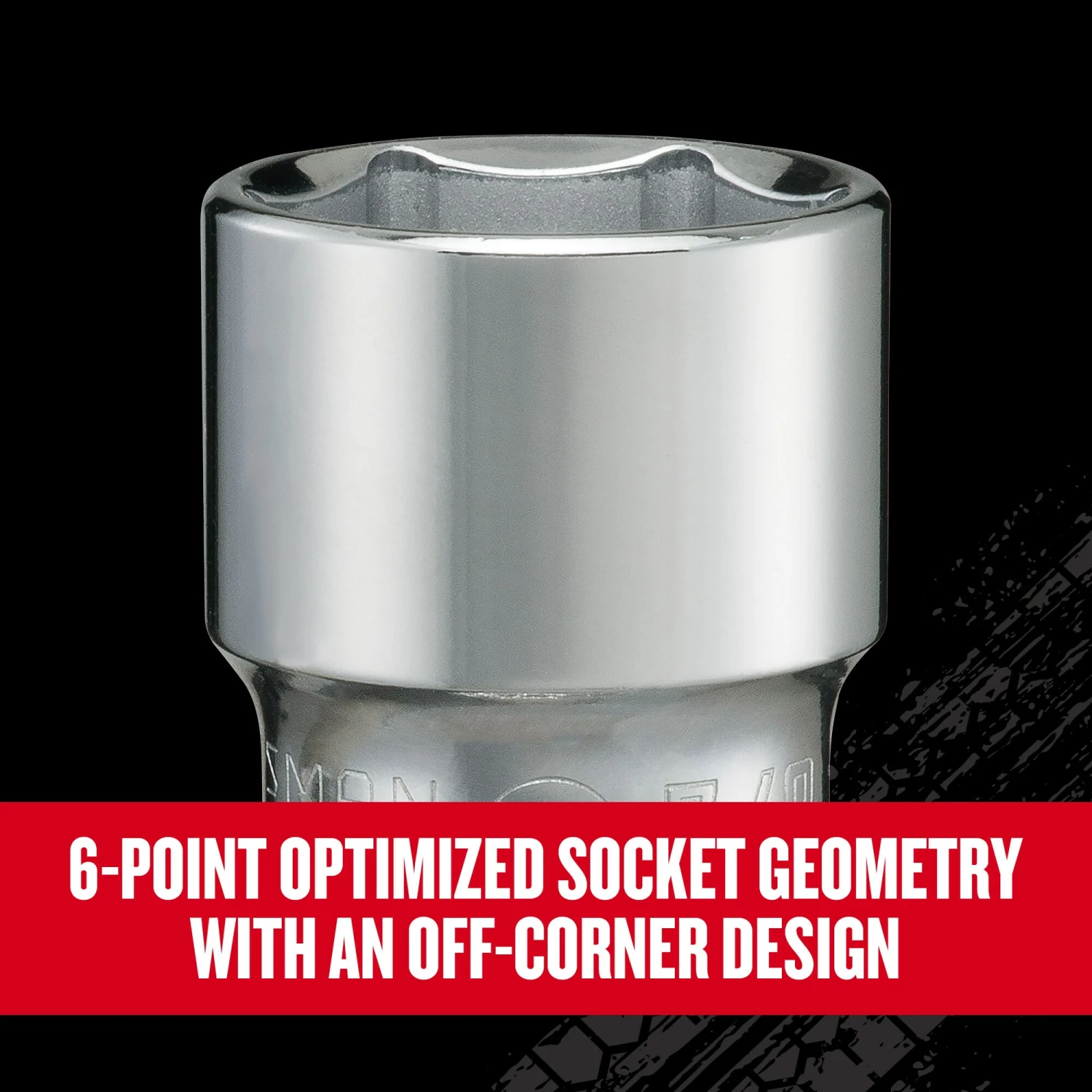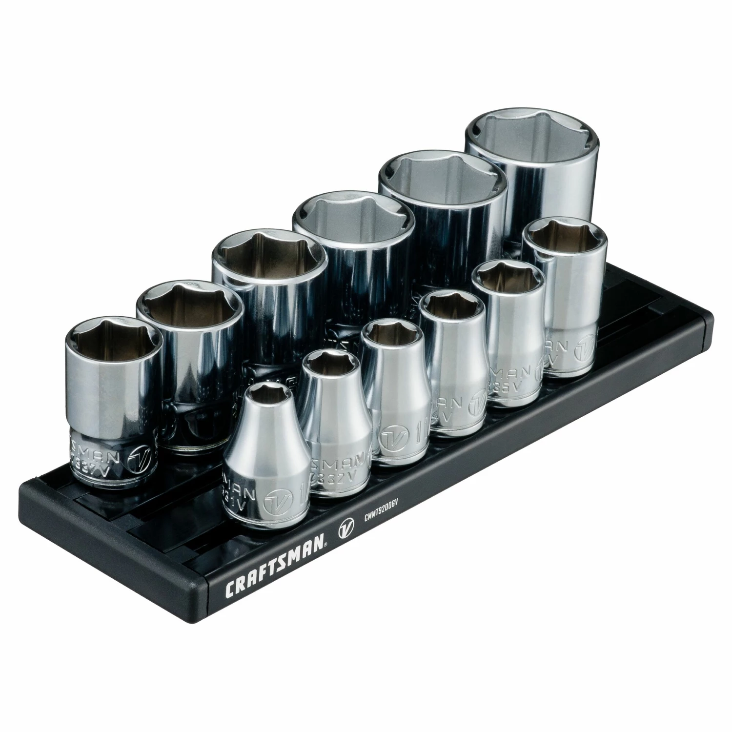 The V-Series 12PC. 3/8″ Drive SAE 6-Point Socket Set delivers unprecendented performance to the Craftsman brand. Engineered for professionals, this socket set features a magnetic socket rail for easy socket storage and organization. The sockets have premium features such as the 6-Point Socket Geometry that maximizes torque onto the flats of fasteners with an off-corner design. Other features include a chamfered and tapered tip design, which provides users with quicker socket-to-fastener engagement. Backed by Craftsman’s Lifetime Warranty, this product is designed to deliver the quality and durability expected from the Craftsman brand. If the product fails to perform for any reason, we will replace it. Return damaged product to a stocking Retail Partner or call 1-888-331-4569 for details. No proof of purchase required.