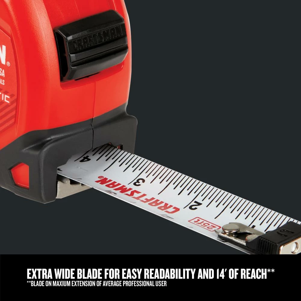 CRAFTSMAN PROREACH tape measures are made in the USA with global materials and are designed to withstand daily jobsite abuse. With 14 feet of blade reach (based on maximum extension of average professional user) and new features designed to enhance the durability of the blade and provide a longer working life, the PROREACH tape measures provide a dependable solution no matter where your work takes you. With a powerful magnetic hook, this tape provides an extra set of hands when working with ferrous metal surfaces commonly found in commercial and industrial construction.