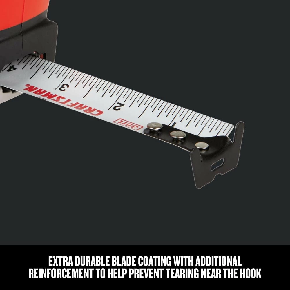 CRAFTSMAN® PROREACH tape measures are made in the USA with global materials and are designed to withstand daily jobsite abuse. With 14 feet of blade reach (based on maximum extension of average professional user) and new features designed to enhance the durability of the blade and provide a longer working life, the PROREACH tape measures provide a dependable solution no matter where your work takes you.