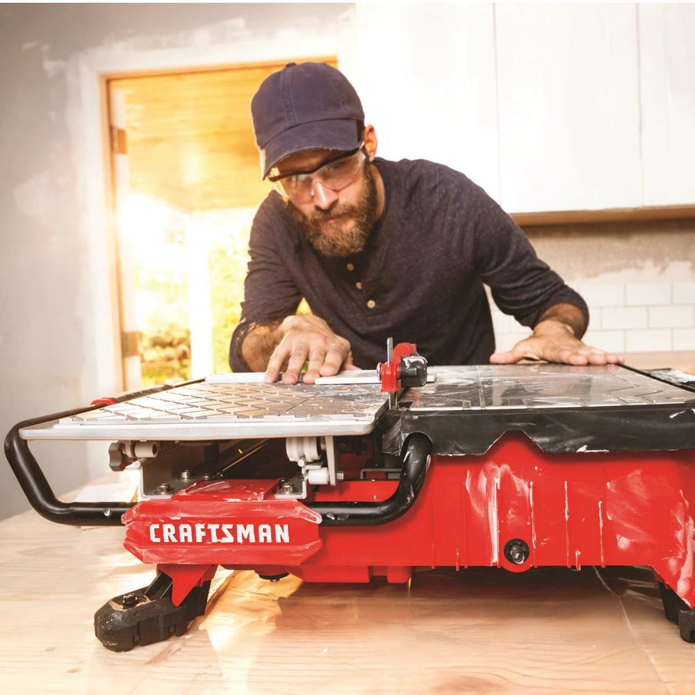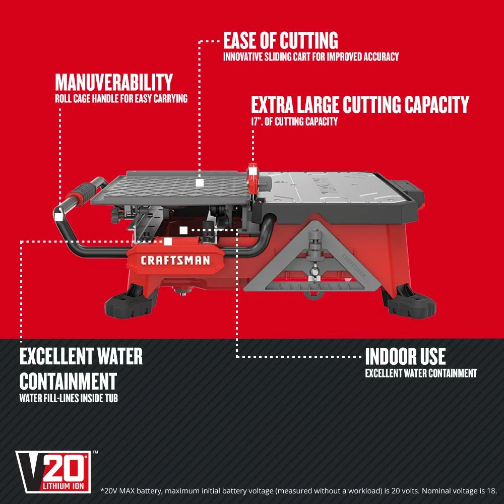- Includes (1) Tile Saw; (1) CMCB204 V20 4.0Ah Lithium Ion Battery; (1) CMCB104 V20 4.0Ah Battery Charger; (1) Blade Wrench; (1) 7-in Diamond Blade; (1) Miter Square