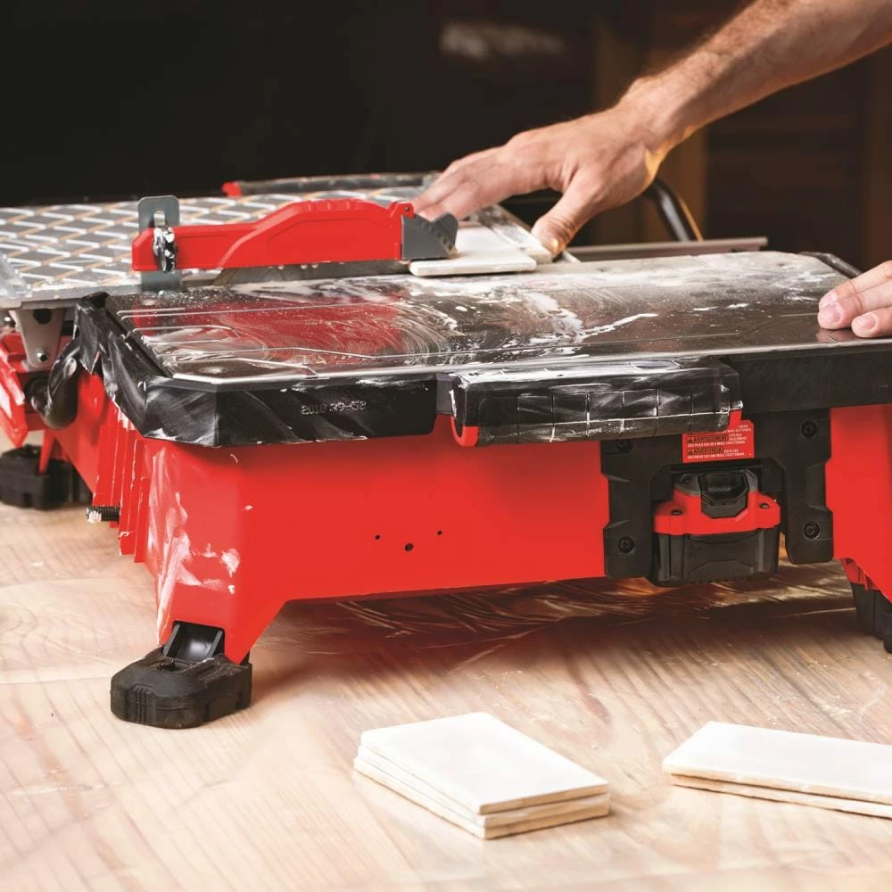 Get your work done from the inside. The V20 Cordless 7-in Compact Wet Tile Saw features water fill-lines inside the tube to help maintain excellent water containment whether the product is being used inside or outside. The innovative sliding cart allows for improved accuracy while allowing the user to have ease of use during tile cutting applications. Store in a compact place, on the job or in the truck, and easy maneuverability with the roll cage handles.