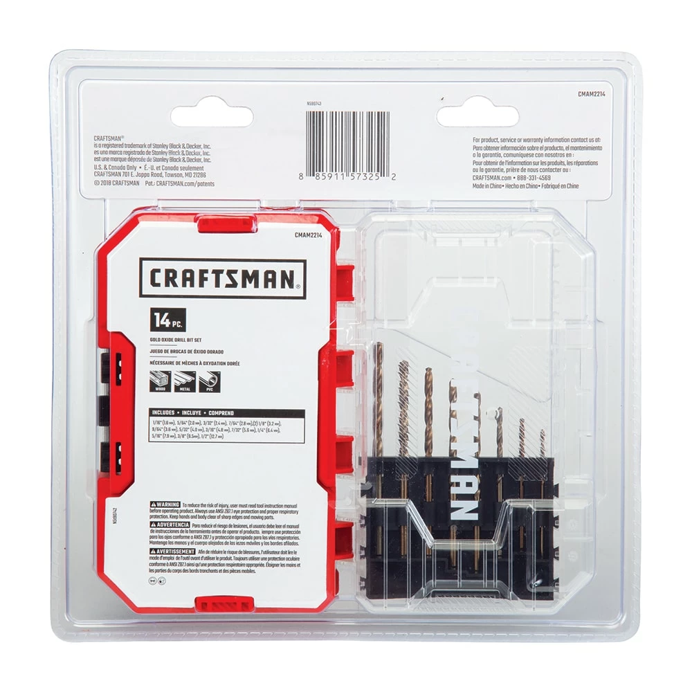 - Includes (14) GOLD OXIDE DRILL BITS: 1/16-in, 15/64-in, 3/32-in, 7/64-in, (2) 1/8-in, 9/64-in, 5/32-in, 3/16-in, 7/32-in, 1/4-in, 5/16-in, 3/8-in, 1/2-in